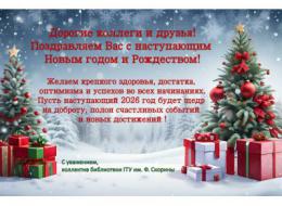 Дорогие коллеги и друзья! С наступающим Новым годом и Рождеством! Желаем крепкого здоровья, достатка, оптимизма и успехов во всех начинаниях. Пусть наступающий 2026 год будет щедр на доброту, полон счастливых событий и новых достижений! С уважением, коллектив библиотеки ГТУ им.…